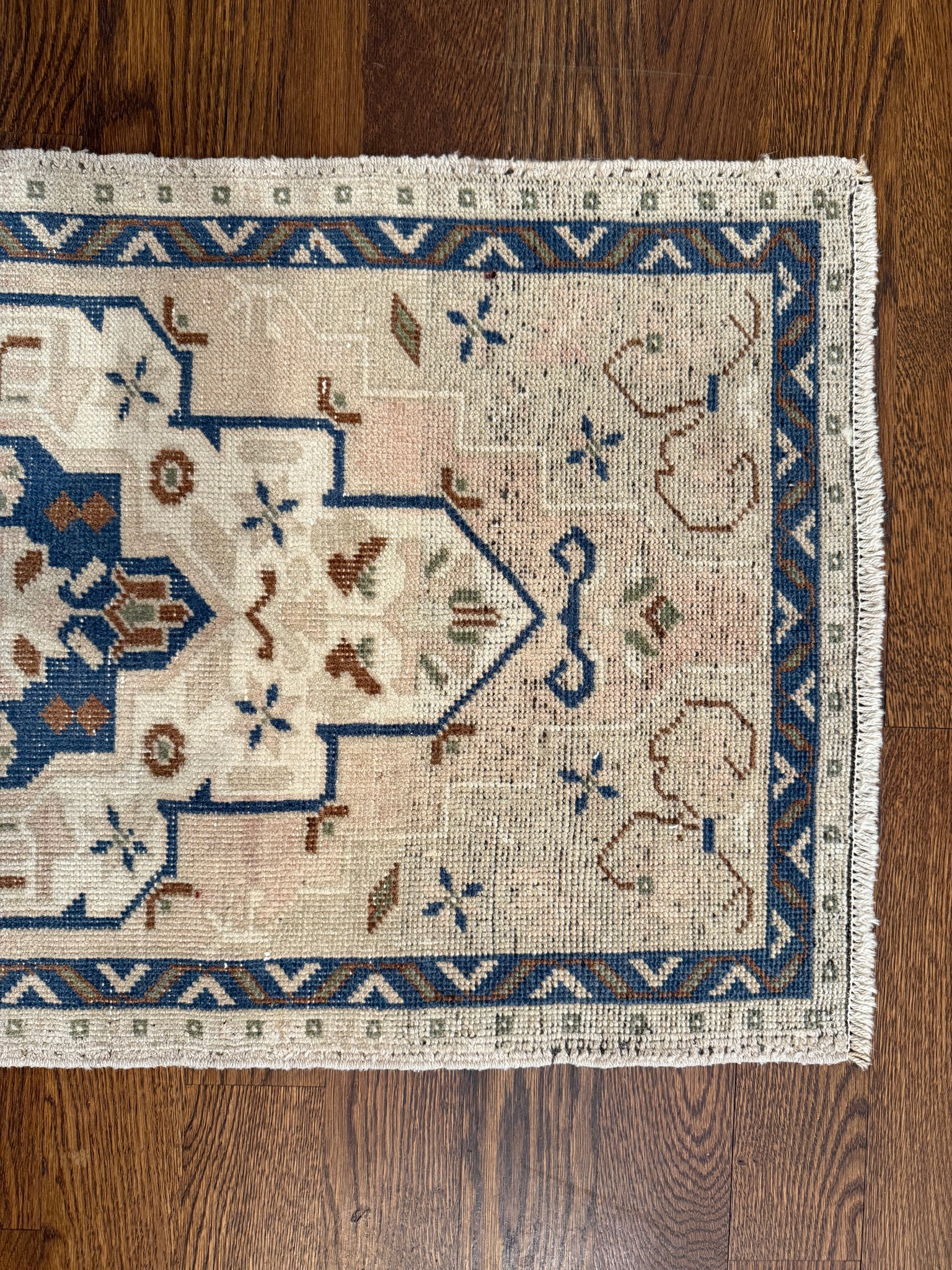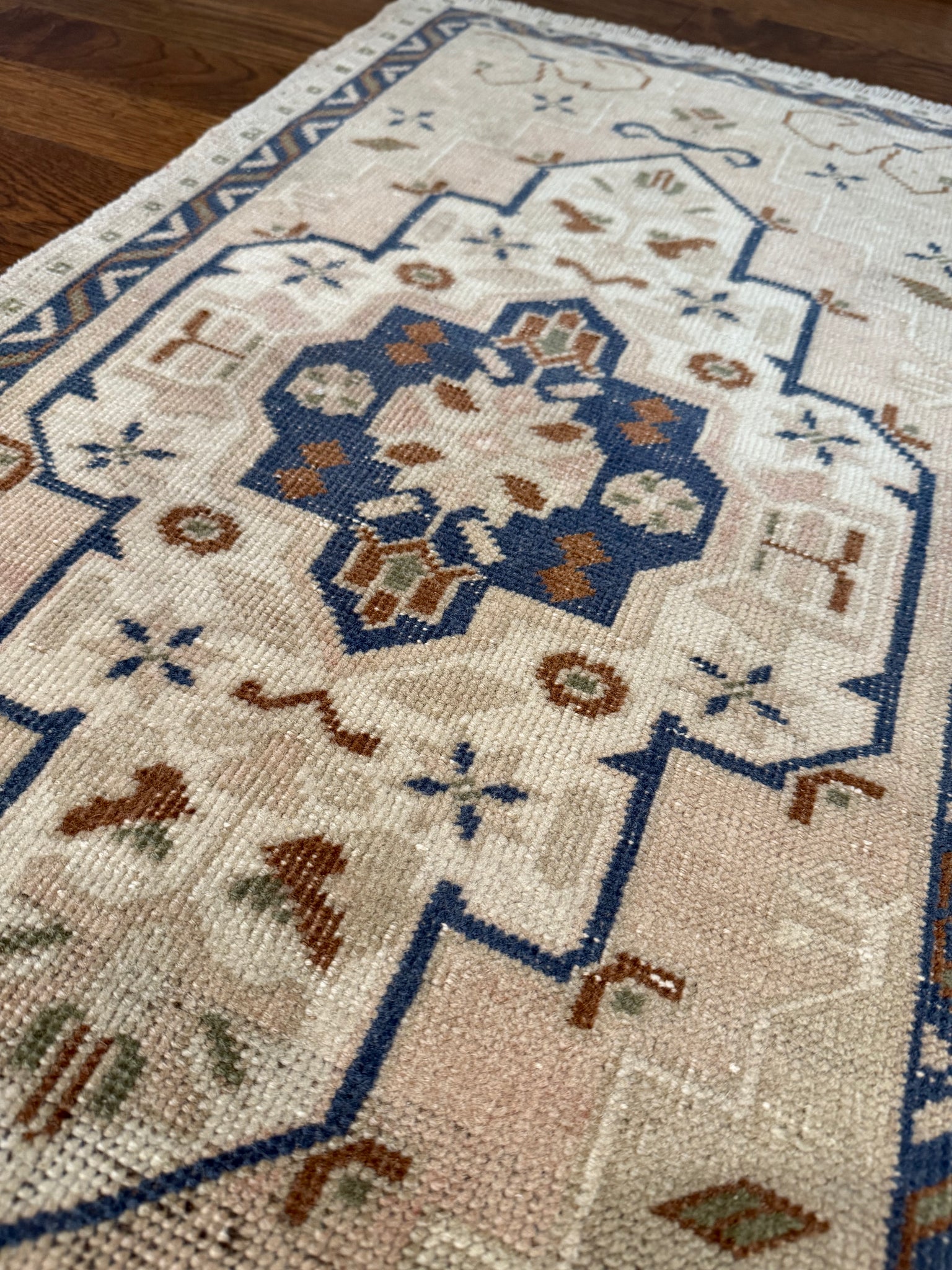 Please note: Due to the nature of wool fibers and natural dyes, a rug’s appearance will vary under different lighting conditions (e.g. brighter colors are revealed in direct sunlight, but may appear muted or dark in shadowy spaces). As they have been woven by hand using natural materials, vintage rugs are rarely perfectly symmetrical in pattern or size, lending each piece a unique, one-of-a-kind character.