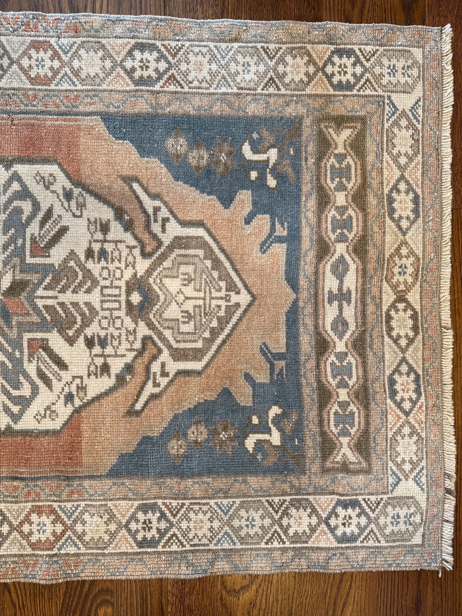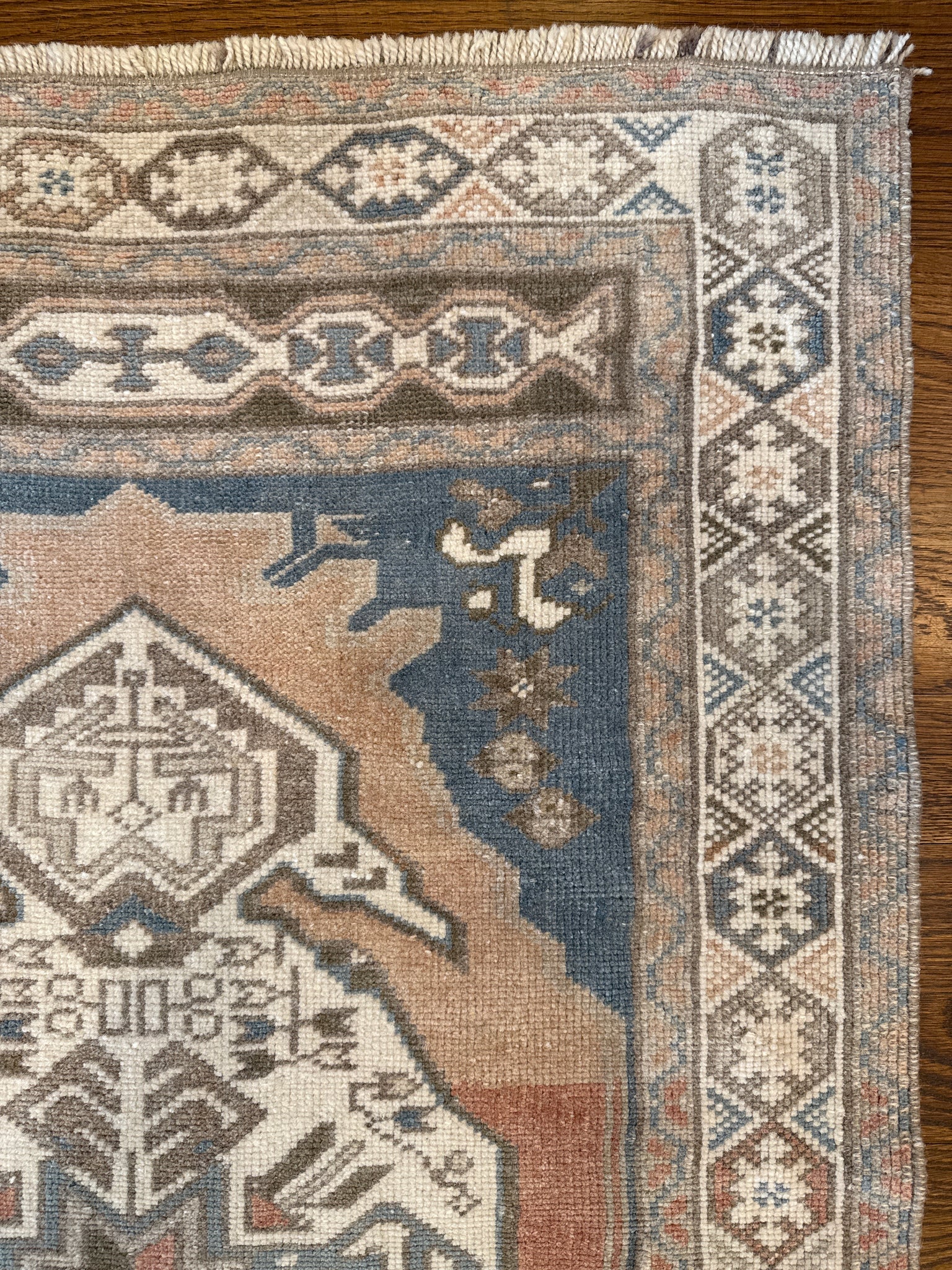 Please note: Due to the nature of wool fibers and natural dyes, a rug’s appearance will vary under different lighting conditions (e.g. brighter colors are revealed in direct sunlight, but may appear muted or dark in shadowy spaces). As they have been woven by hand using natural materials, vintage rugs are rarely perfectly symmetrical in pattern or size, lending each piece a unique, one-of-a-kind character.
